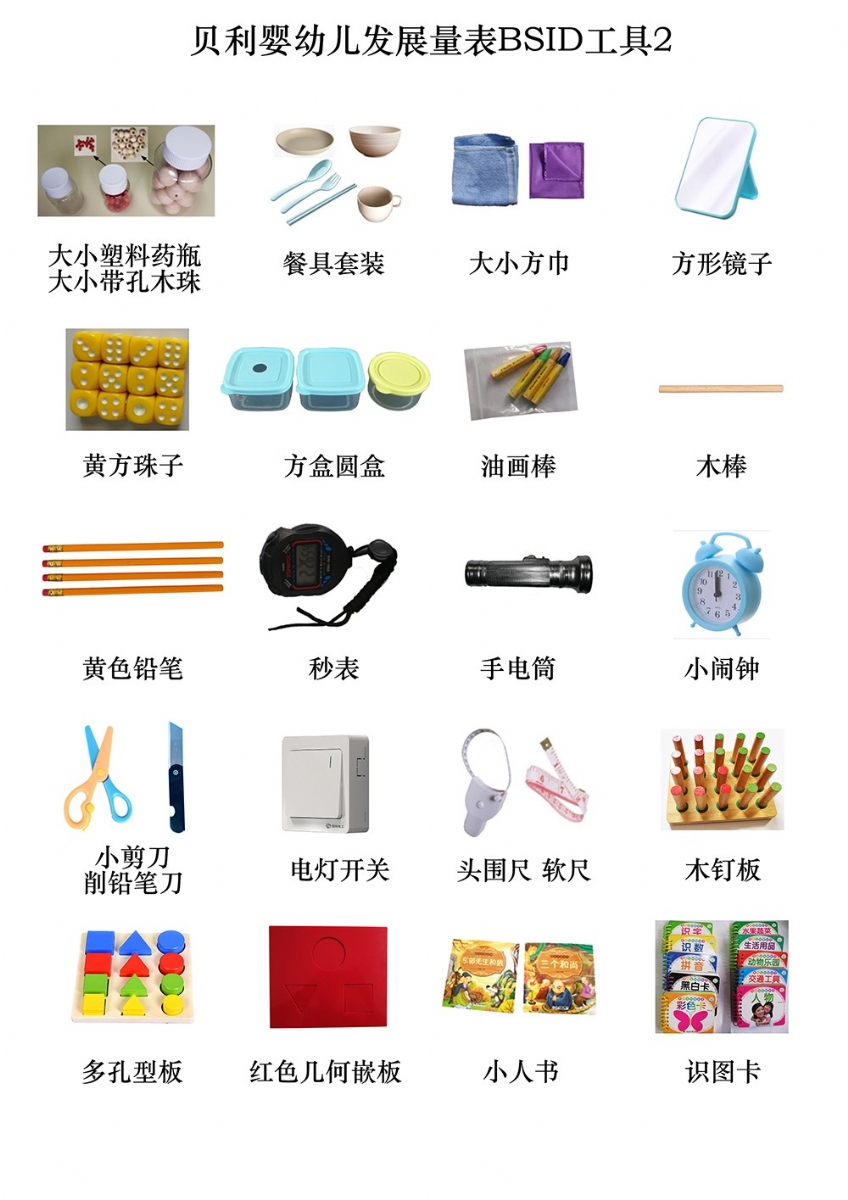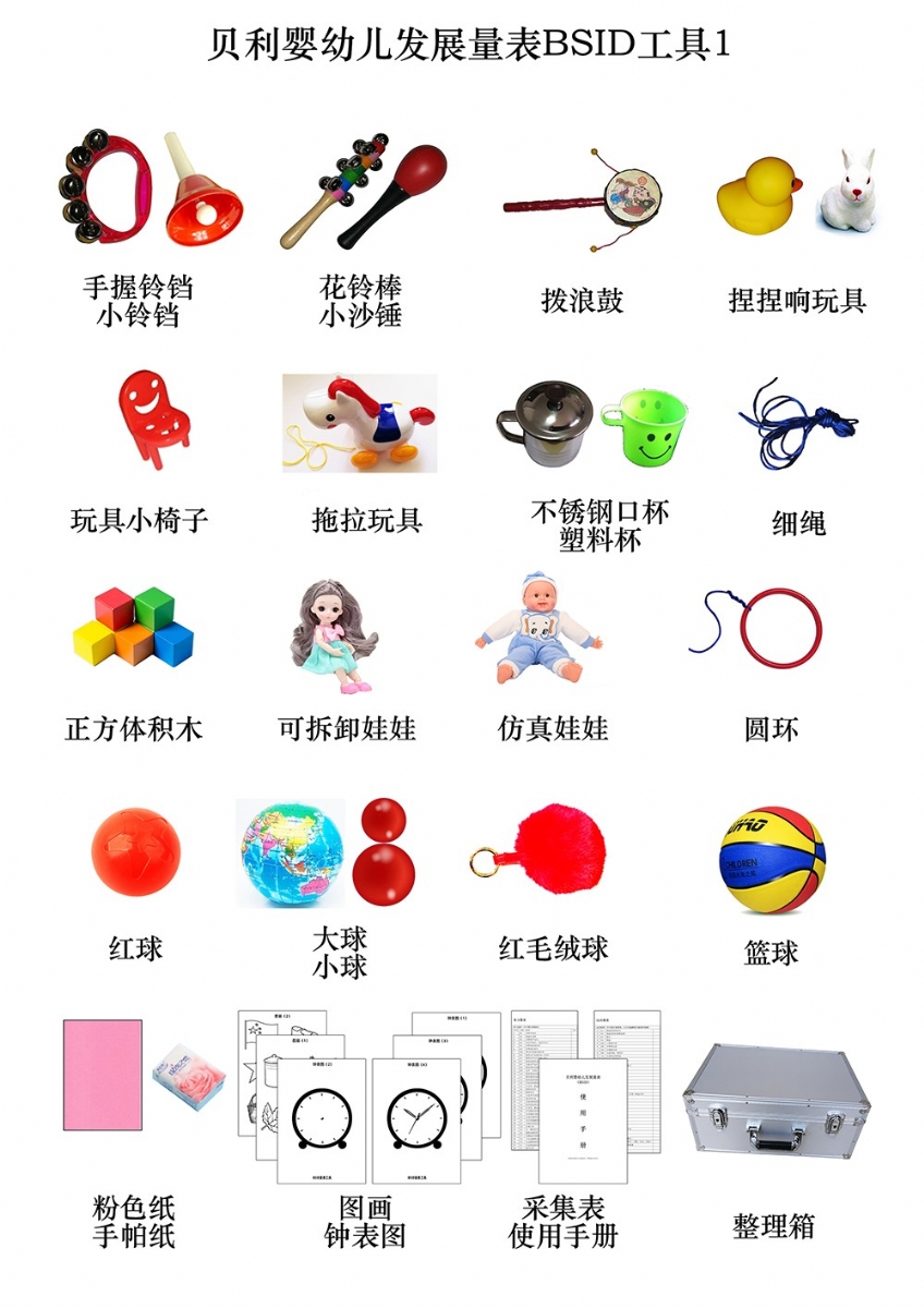 手握鈴鐺、小鈴鐺、花鈴棒、撥浪鼓、小沙錘、捏捏響玩具、玩具小椅子、拖拉玩具(帶線)、小正方體積木(紅12個(gè),黃藍(lán)綠各2塊)、可拆卸娃娃、布娃娃、圓環(huán)、紅球、大球、紅毛絨球、籃球、紅色小球、細(xì)繩、不銹鋼口杯、塑料杯、大號(hào)塑料藥瓶、小號(hào)塑料藥瓶、餐具套裝、大小方巾、方形鏡子、大木珠(帶孔)、小木珠(帶孔、)黃方珠子、塑料方盒、塑料圓盒、油畫棒、指揮棒、黃色鉛筆、秒表、手電筒、小鬧鐘、電燈開(kāi)關(guān)、頭圍尺、軟尺、木釘板、多孔型板(含圓形、方形、三角形各4塊)、幾何嵌板(含圓、三角、方形,厚8mm)、小人書識(shí)圖卡(果蔬、人物、動(dòng)物、交通等)、粉色卡紙、手帕紙、鐘表圖1234、圖畫12(BSID)、BSID采集表、BSID使用手冊(cè)、整理箱等。
