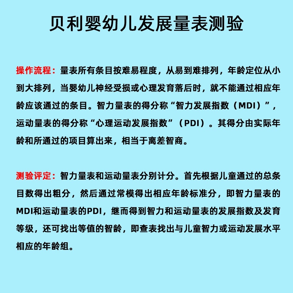 量表所有條目按難易程度,從易到難排列,年齡定位從小到大排列,當嬰幼兒神經(jīng)受損或心理發(fā)育落后時,就不能通過相應年齡應該通過的條目。智力量表的得分稱“智力發(fā)展指數(shù)(MDI)”,運動量表的得分稱“心理運動發(fā)展指數(shù)”(PDI)。其得分由實際年齡和所通過的項目算出來,相當于離差智商。